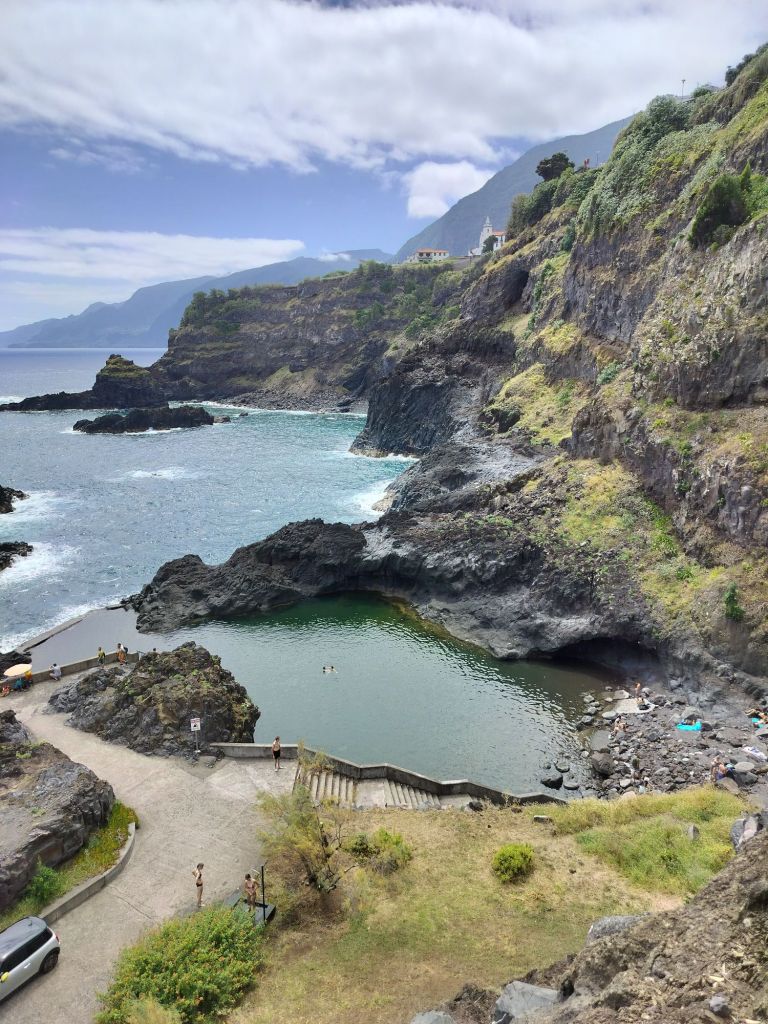 הבוקר הראשון בפונשל – נסענו לסיישל, חופים סלעיים עם בריכות טבעיות מדהימות עם טמפרטורת מים חמימה יותר ביחס למי האוקיינוס הקרירים. גם החופים הפראיים האלו בכולם יש שירותי הצלה, שירותים ומלתחות לשימוש המבקרים, מסעדה. קפה ושייק אננס . החוף השחור עם המפל חוף מיוחד מאוד מושך מבקרים ורוחצים רבים